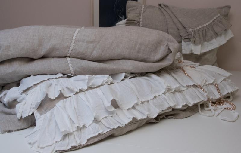 Богато декорированнный пододеяльник: рюши, завязки, тесьма. Сочетания белого и натурально- серого цветов вносят нотку акварельности и природной естественности.